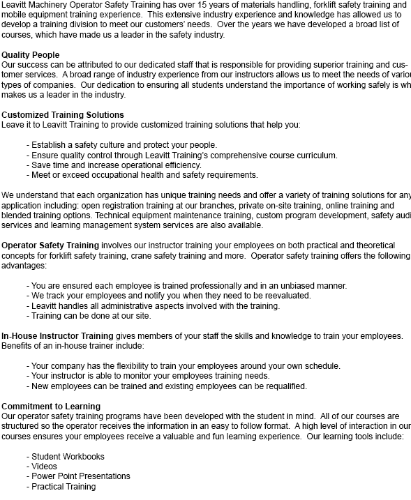 Our significant number of programs should ensure that you will come across the right one for you or your workforce. Training can be conducted at our site or at your facility. Our ability to tailor our instruction methods to your equipment is what sets us apart from our competition.